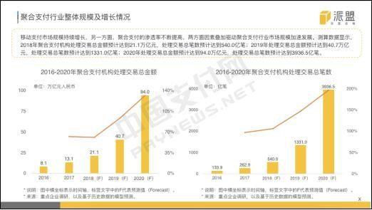 從產(chǎn)業(yè)發(fā)展規(guī)模來說,一方面,移動支付市場規(guī)模持續(xù)增長,另一方面,聚合支付的滲透率也在不斷提高,兩方面因素疊加驅(qū)動聚合支付行業(yè)市場規(guī)模加速發(fā)展。報告預測,2020年聚合支付全年處理交易總金額預計達到94.0萬億元,處理交易總筆數(shù)預計達到3936.5億筆。