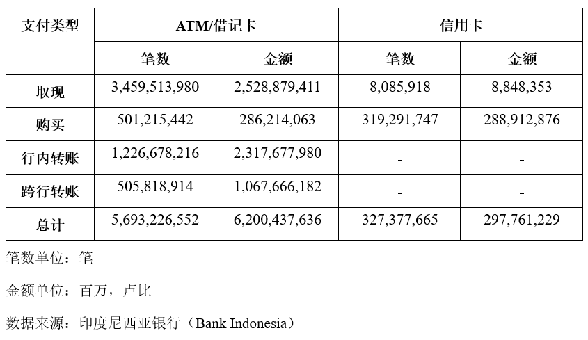 截至2018年10月24日,印尼獲得信用卡各類(lèi)運(yùn)營(yíng)資質(zhì)的機(jī)構(gòu)共有34家。截至2018年11月12日,獲得ATM或借記卡運(yùn)營(yíng)資質(zhì)的機(jī)構(gòu)共有121家。截至2018年8月,印尼借記卡(含ATM卡)總數(shù)1.615億張,信用卡總數(shù)為1720萬(wàn)張,2017年銀行卡支付交易數(shù)據(jù)如下表所示。