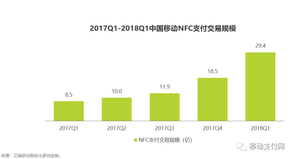 根據(jù)艾瑞《2018年中國移動NFC支付行業(yè)研究報告》的統(tǒng)計數(shù)據(jù),2017年我國移動NFC支付規(guī)模達到了48.9億元,而且從2017Q1-2018Q1的環(huán)比增速來看,該市場規(guī)模正進入加速增長階段。2018Q1我國移動NFC支付規(guī)模繼續(xù)保持著加速增長的速度,達到29.4億元。