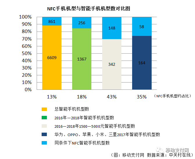 去年,移動支付網(wǎng)在整理NFC手機數(shù)據(jù)方面,可以看出NFC手機在三年以來1500元以上的機型中占比率達到了近45%,而排名前五的手機型號中,NFC手機占比達到了35%。移動支付網(wǎng)曾預測,2018年以后國內(nèi)主流智能手機的中高端機型將都會配置NFC功能,包括OPPO、vivo。