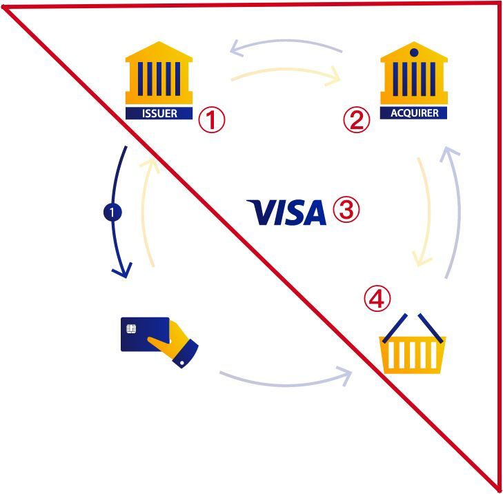 上面這張圖是VISA官網(wǎng)關(guān)于“四方模式”的示意圖,仔細(xì)看的話(huà),你會(huì)發(fā)現(xiàn)圖里面有5個(gè)圖標(biāo),代表了5個(gè)主體,但事實(shí)上這其中只有4個(gè)主體參與到了利益分配鏈里面去,所以VISA也沒(méi)有將這個(gè)模式稱(chēng)為“五方模式”,而是“四方模式”。示意圖中,參與到利益分配鏈的四方分別是:①代表發(fā)卡銀行,是指向消費(fèi)者發(fā)行信用卡的銀行;②代表收單機(jī)構(gòu),是指為商戶(hù)提供收款服務(wù)的機(jī)構(gòu);③代表卡組織,④代表商戶(hù)。剩下的第5個(gè)圖標(biāo)則代表是持卡的消費(fèi)者。