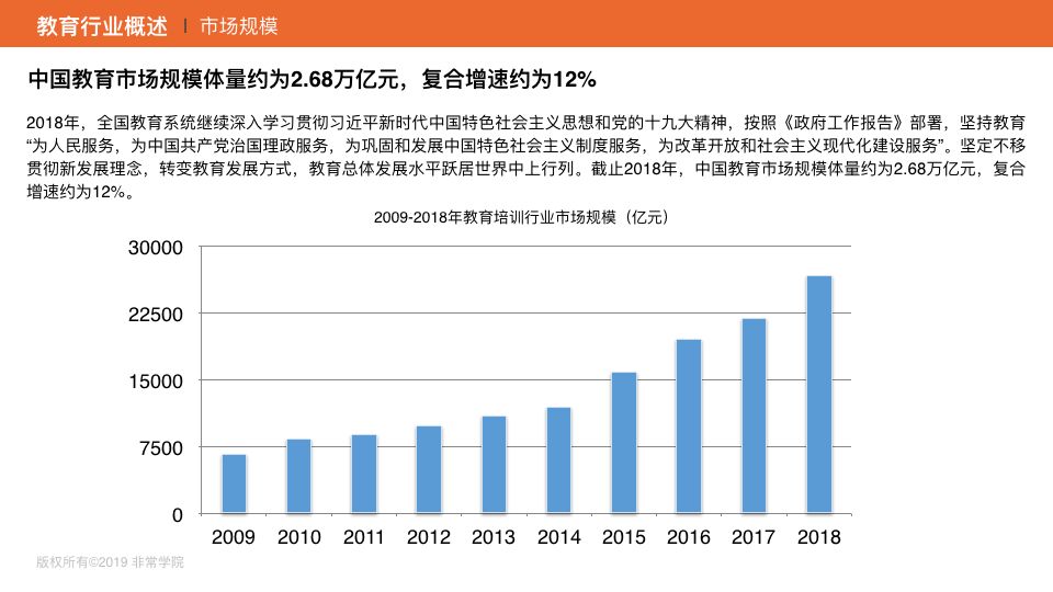 2018中國教育市場規(guī)模達(dá)2.68萬億元,復(fù)合增速約為12%