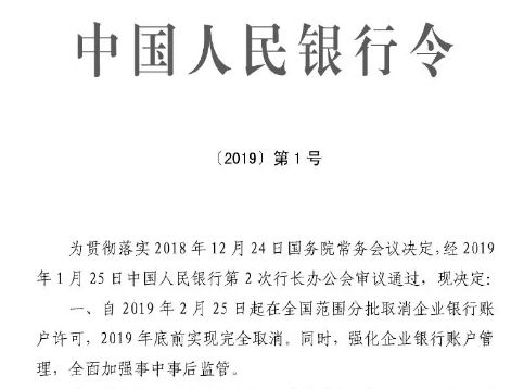 央行2019年1號令:取消企業(yè)開戶許可證 機(jī)關(guān)事業(yè)單位除外