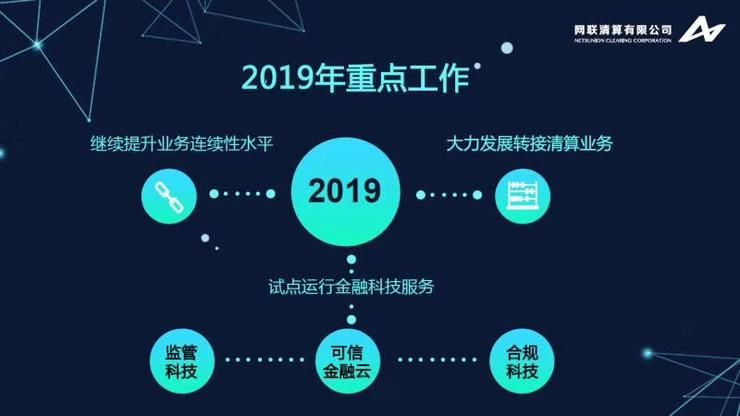 而在2019年,網(wǎng)聯(lián)主要的工作重點(diǎn)包括:1、繼續(xù)提升業(yè)務(wù)連續(xù)性水平;2、大力發(fā)展轉(zhuǎn)接清算業(yè)務(wù);3、試點(diǎn)運(yùn)行金融科技服務(wù)。